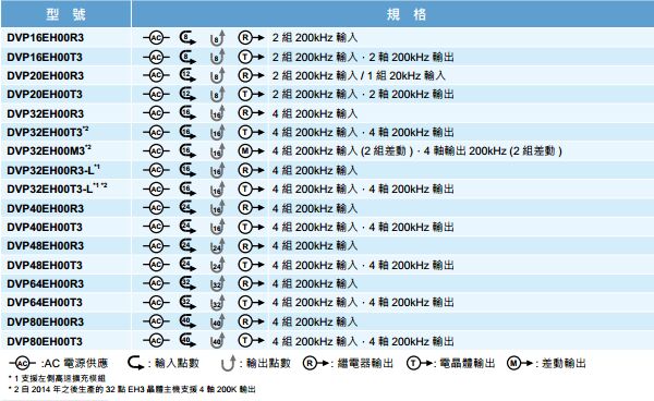 | DVP16EH00T3 | 16点主机,8DI/8DO(NPN/24Vdc/0.3A), 2路200K输入/输出 |