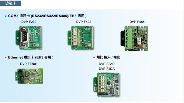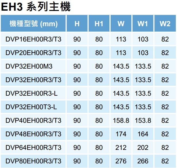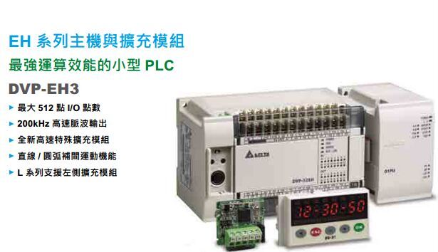 | DVP16EH00R3 | 16点主机,8DI/8DO(继电器/250Vac/24Vdc/2A), 2路200K输入 |
