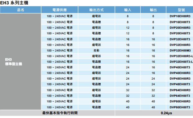 | DVP40EH00T3 | 40点主机, 24DI/16DO(NPN/24Vdc/0.3A), 4路200K输入/输出 |