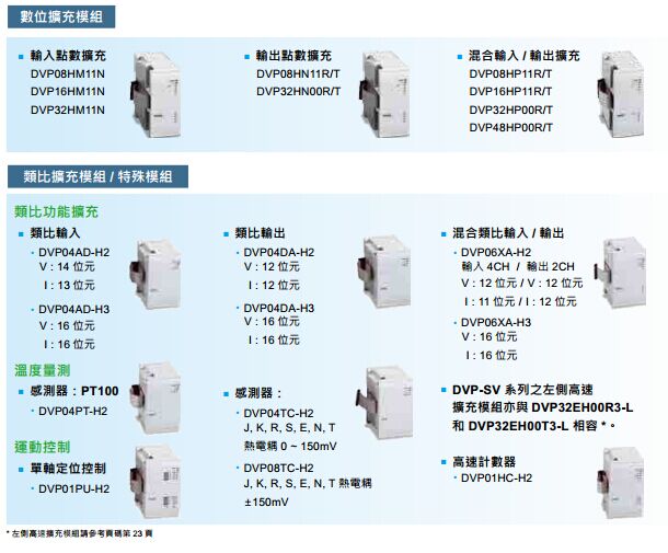 | DVP32EH00R3-L | 32点主机, 16DI/16DO(继电器/250Vac/24Vdc/2A), 4路200K输入,含左侧扩展接口 |