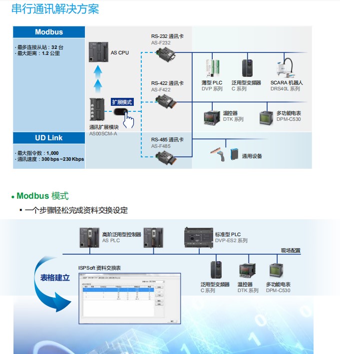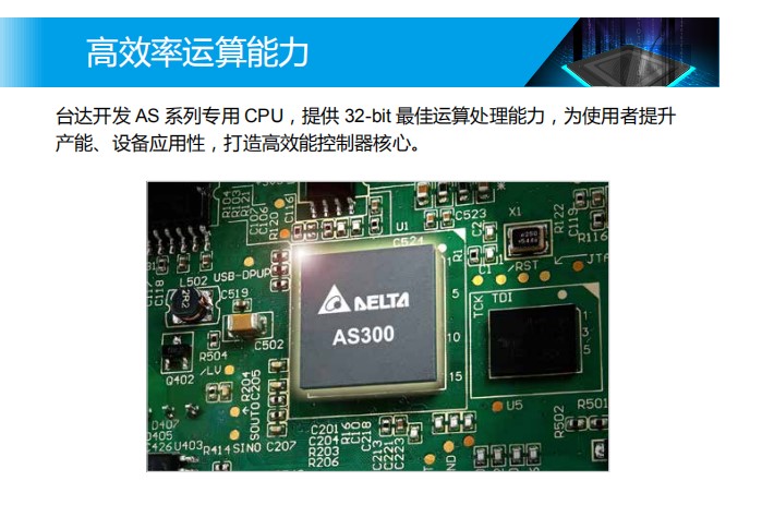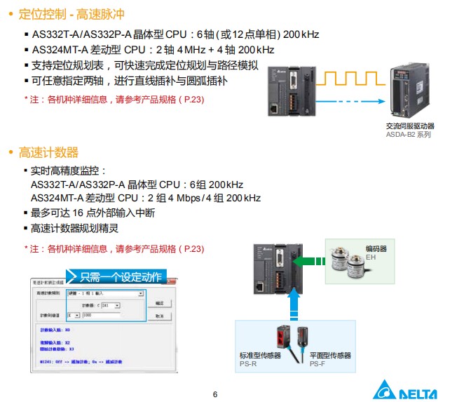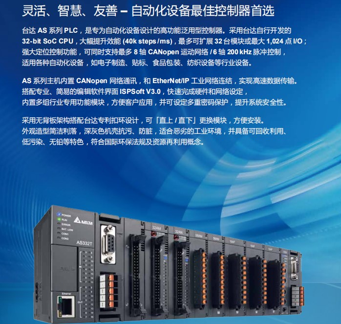| AS300 | AS332T-A | 16DI, 16DO(NPN), 6组200K AB相输入, 6轴200K AB相输出, 128K步容量, 内建以太网口, RS485x2, Micro SD卡, 以及可选配2个功能卡 |