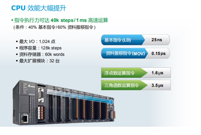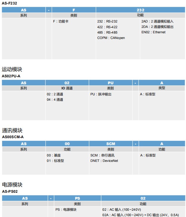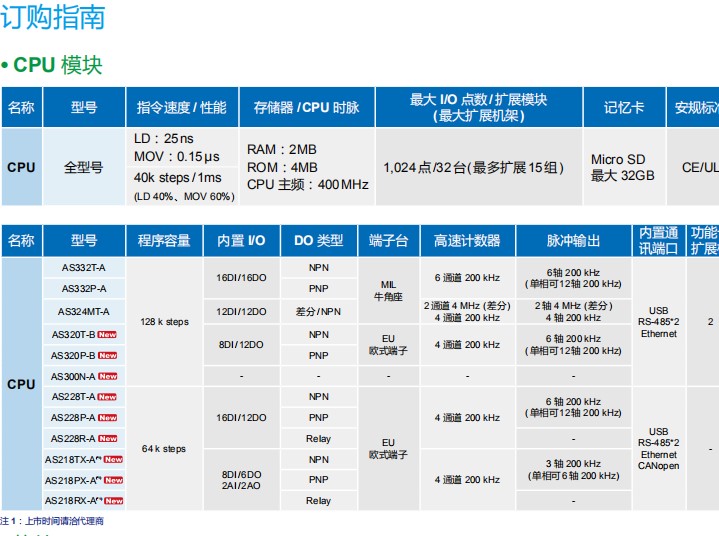 | AS300 | AS332P-A | 16DI, 16DO(PNP), 6组200K AB相输入, 6轴200K AB相输出, 128K步容量, 内建以太网口, RS485x2, Micro SD卡, 以及可选配2个功能卡 |
