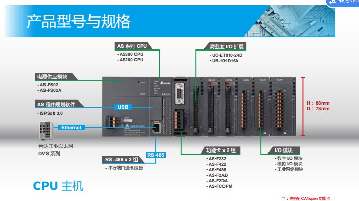 | AS300 | AS300N-A | 无自带端子,128K步容量, 内建以太网口, RS485x2, Micro SD卡, 以及可选配2个功能卡 |