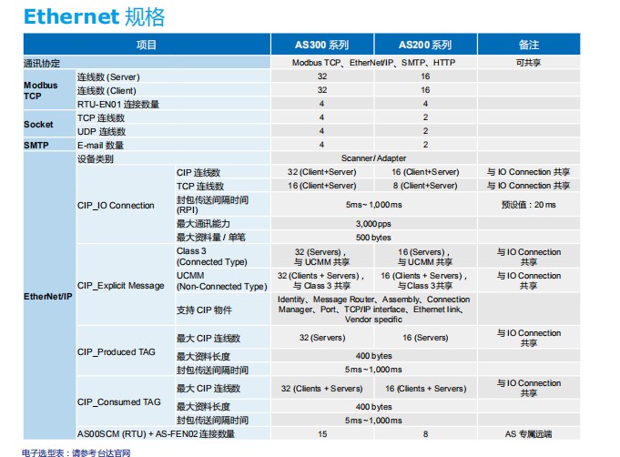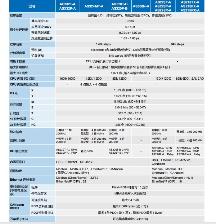 | AS300 | AS324MT-A | 12DI, 12DO(NPN), 2组4M差动输入, 2轴4M差动输出, 4组200K AB相输入, 4轴200K AB相输出, 128K步容量, 以太网口, RS485x2, Micro SD卡, 及选配2个功能卡 |