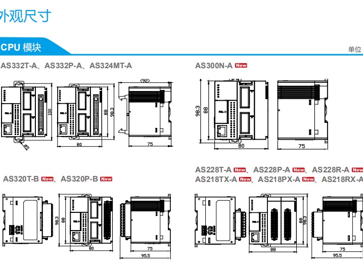 | AS200 | AS218TX-A | 欧式端子8DI,6DO(NPN),2AI,2AO,4组200K AB相输入, 3轴200K AB相输出, 64K步容量, 内建以太网口, RS485x2, 集成Canopen |