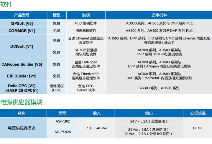 | AS300 | AS-PS02A | 100~220VAC IN, 24VDC(1.5A)(PLC内部用)+24VDC(0.5A) OUT(外部用) |