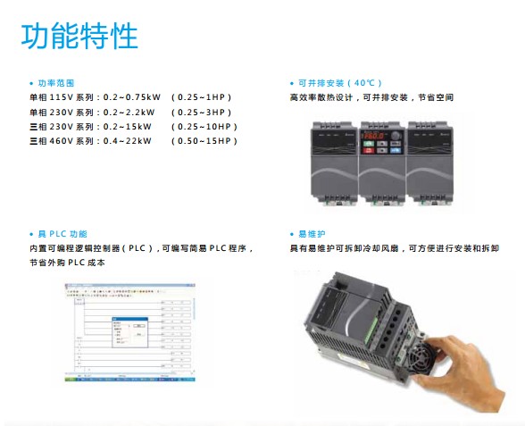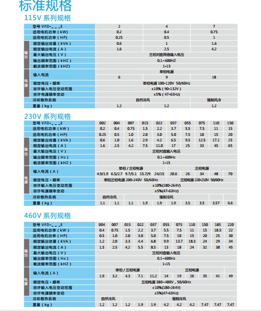 | VFD-E | VFD022E23A | 3P220V,2200W,IP20,内置煞车单元 |