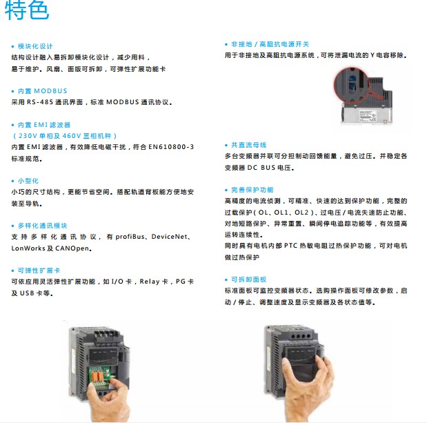 | VFD-E | VFD022E43C | 3P460V,2200W,IP20,内置CanoPen通讯接口、EMI滤波器、剎车单元 |