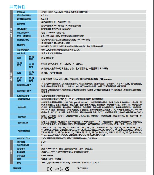 | VFD-E | VFD015E43C | 3P460V,1500W,IP20,内置CanoPen通讯接口、EMI滤波器 |