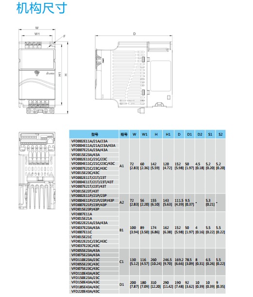 | VFD-E | VFD002E11A | 1P110V,200W,IP20,无EMC,标准版 |