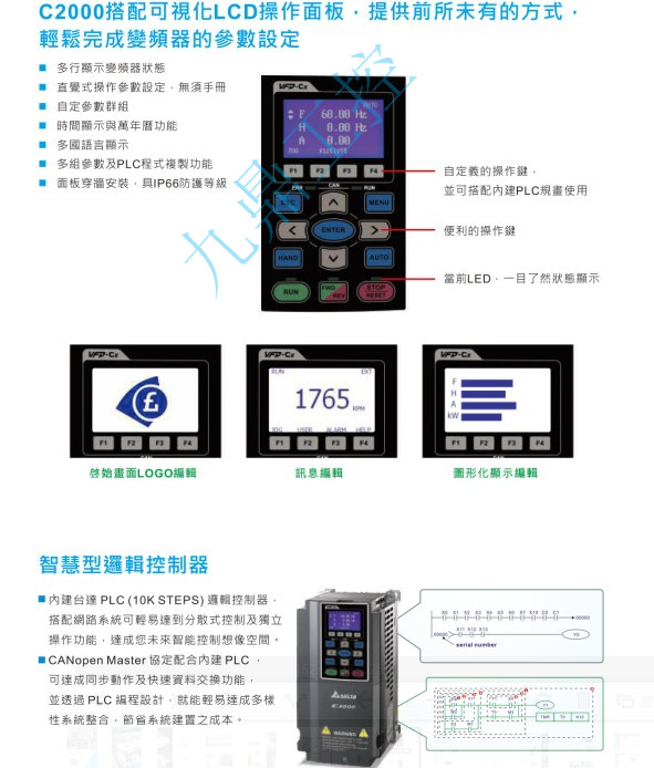 VFD-CH VFD015CH4EA-21 380V/3P,1.5kW,内置10k PLC,刹车内建,DC电抗选购,EMC内建UL,CE,IP20,NEMA1