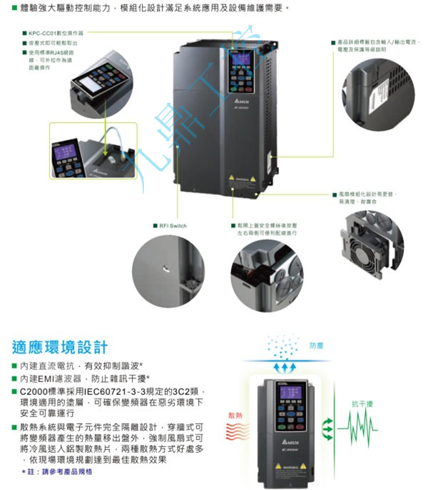 VFD-CH VFD022CH43A-21 380V/3P,2.2kW,内置10k PLC,刹车内建,DC电抗选购, UL,CE,IP20,NEMA1